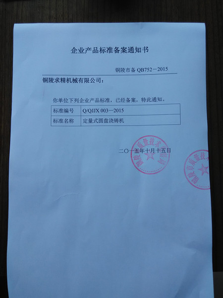 我公司制定的定量式圓盤澆鑄機企業(yè)標準已審核備案